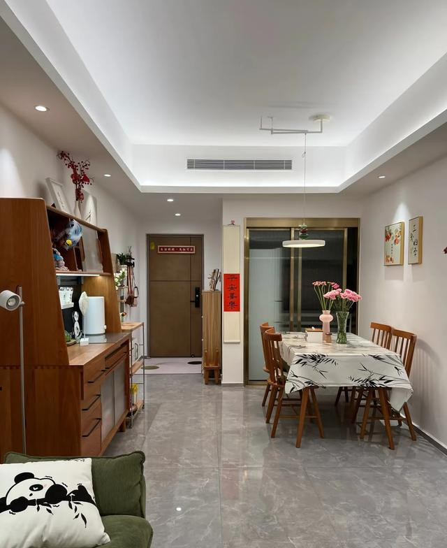 家具摆放疏密有致,留出活动空间,核心家具,如沙发框架、餐桌椅、床、柜门等用实木,木饰面做局部点缀,地面可以根据情况选择柔光砖/亚光砖,或者实木地板。